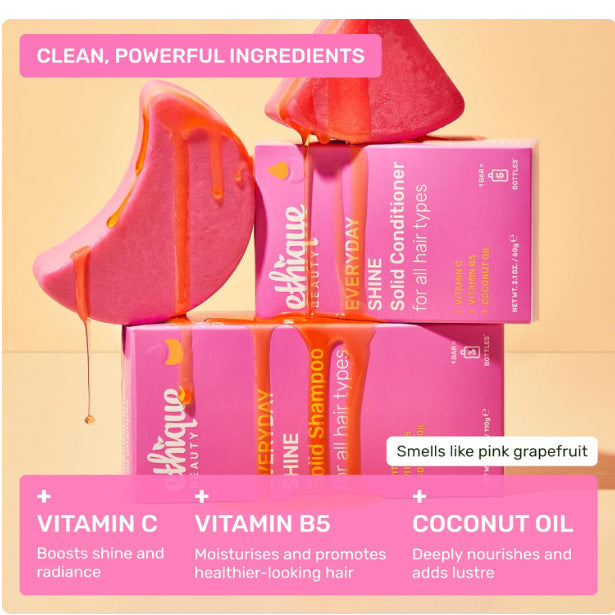 Get soft, shiny hair with Ethique Everyday Shampoo Bar. Infused with Vitamin C, this plastic-free, cruelty-free, and vegan bar is a win-win for you and the planet. No more plastic waste, just lovely hair. (Hair today, gone tomorrow!)